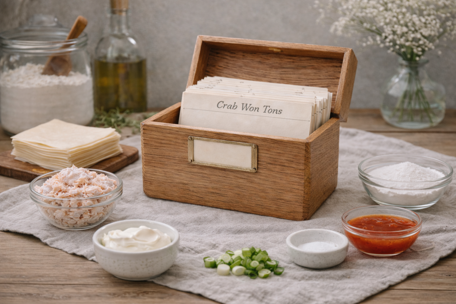 - In a bowl, mix together the cream cheese, crab meat, and chopped green onions. Season with salt and pepper to taste.Place 1 tablespoon of the mixture in the center of each won ton wrapper.Seal the edges of the wrapper with water to form a tight seal.Heat oil in a deep fryer to 350°F (175°C). Fry the won tons until golden brown, about 3-4 minutes.Remove from oil and drain on paper towels.Serve with sweet chili sauce for dipping.