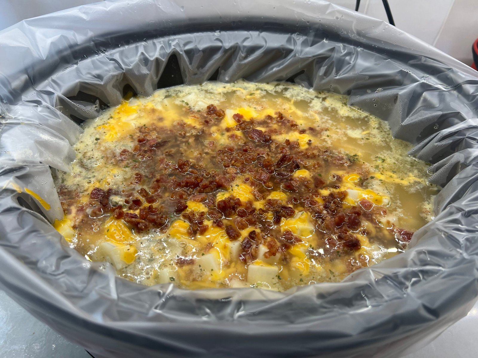 Layer the potatoes, cheddar cheese, bacon, and ranch seasoning in the slow cooker.