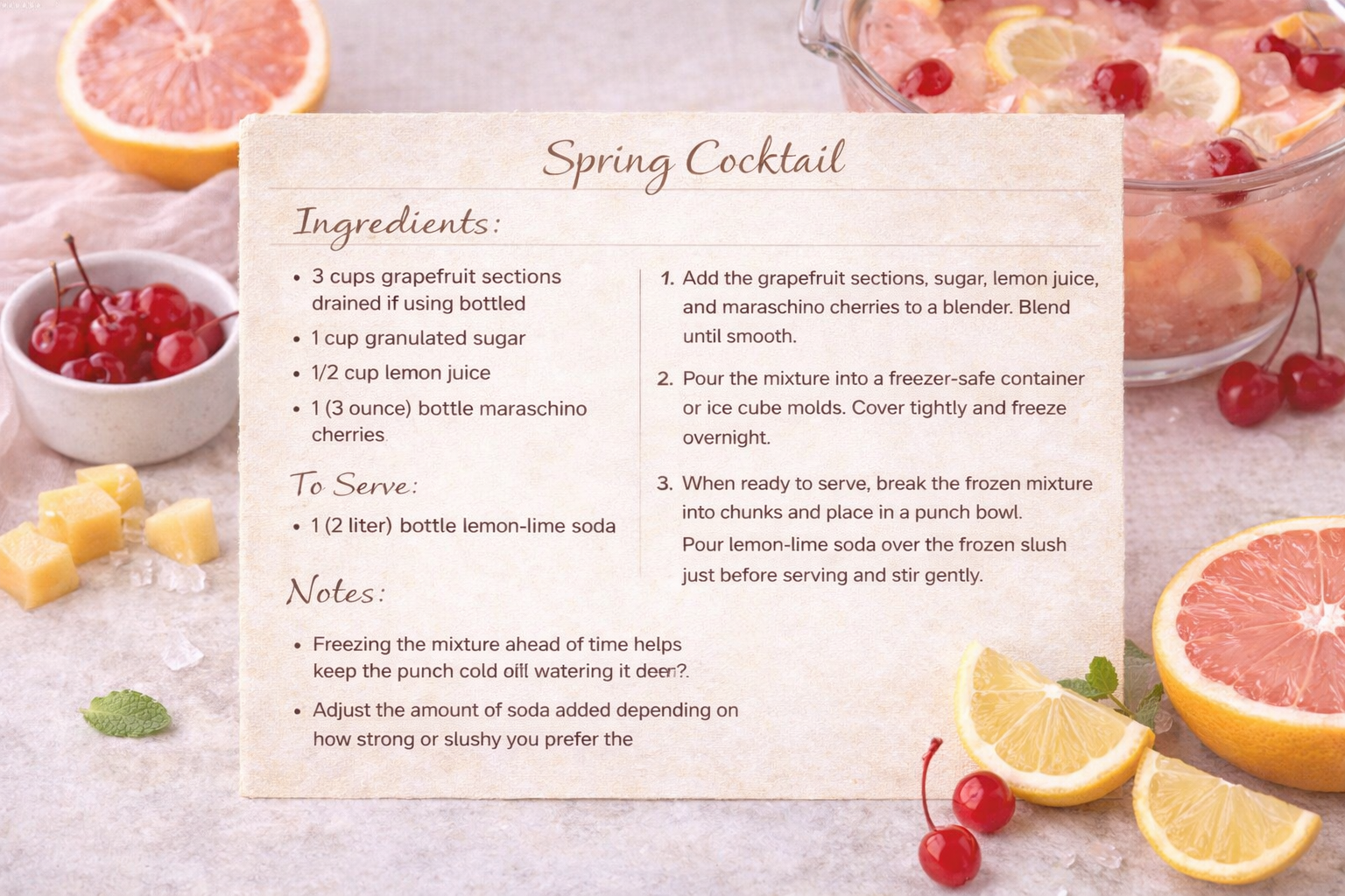 - Add the grapefruit sections, sugar, lemon juice, and maraschino cherries to a blender.Blend until smooth.Pour the mixture into a freezer-safe container or ice cube molds. Cover tightly and freeze overnight.When ready to serve, break the frozen mixture into chunks and place in a punch bowl.Pour lemon-lime soda over the frozen mixture just before serving and stir gently.